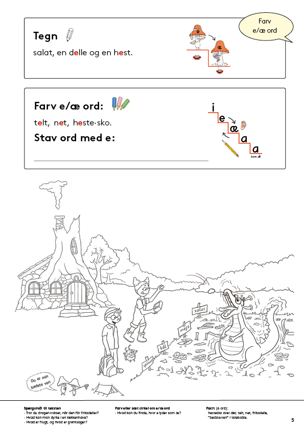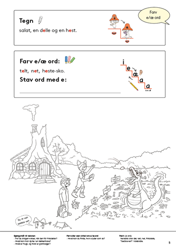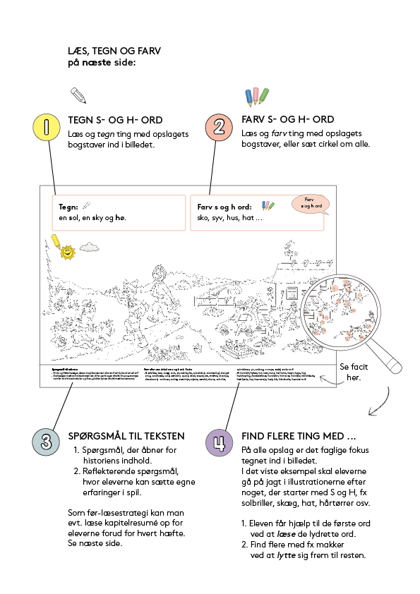 Eleverne læser og løser opgaver i et ”Søg og find”-univers, hvor alfabet og udtaleregler er indtegnet i illustrationerne. Find og farv fx ting, der starter
